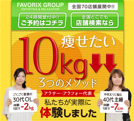 フェイバリックスグループのセルライト撃退コースは、1回で2s以上の体重減・大幅サイズダウンが期待できるとされています。